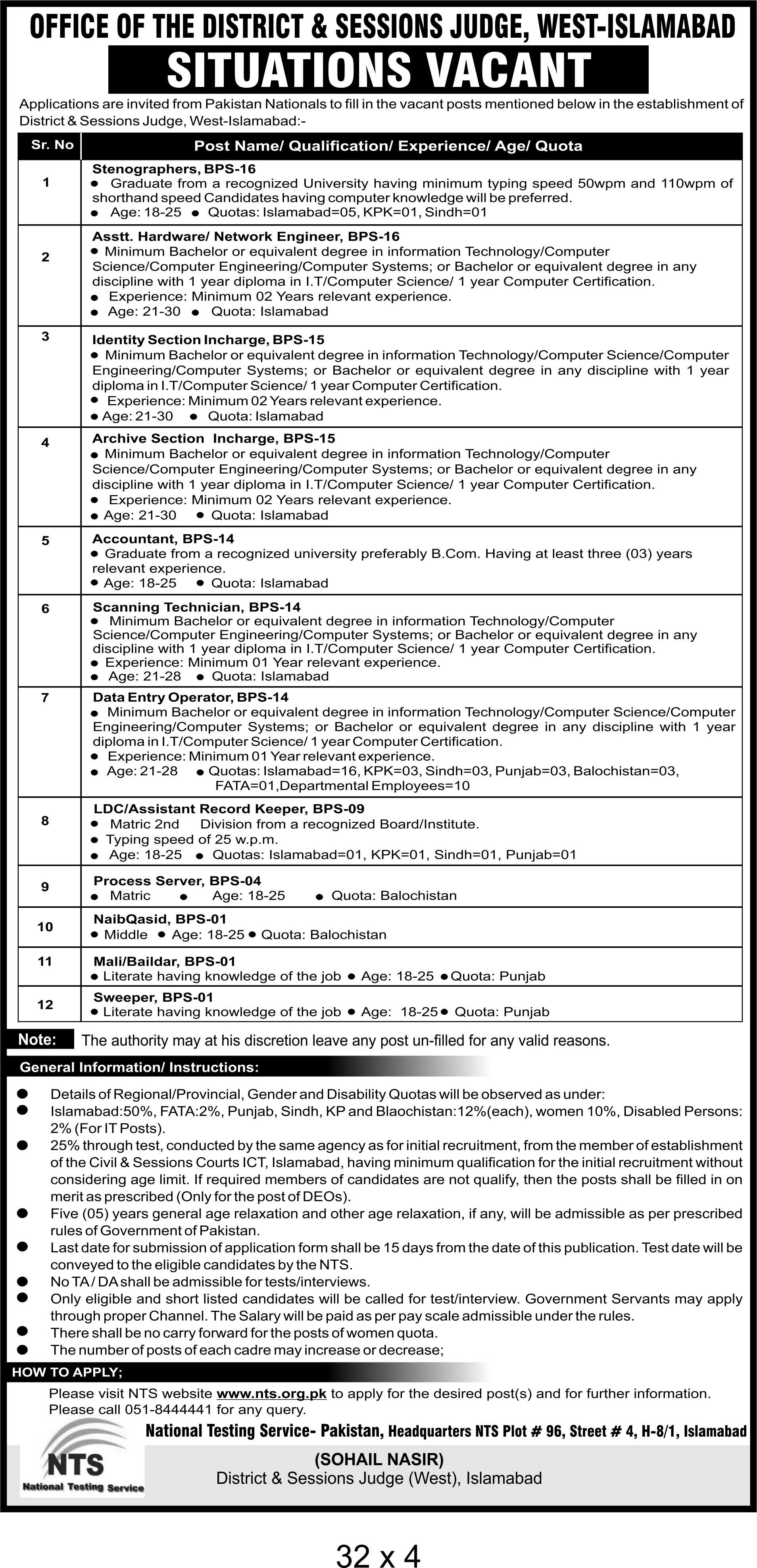 The detailed job eligibility criteria can be viewed in newspaper ad image for all vacancies. The candidates are required to fulfil the mentioned criteria of Jobs in Office of the District & Sessions Judge, West Islamabad is as below:
