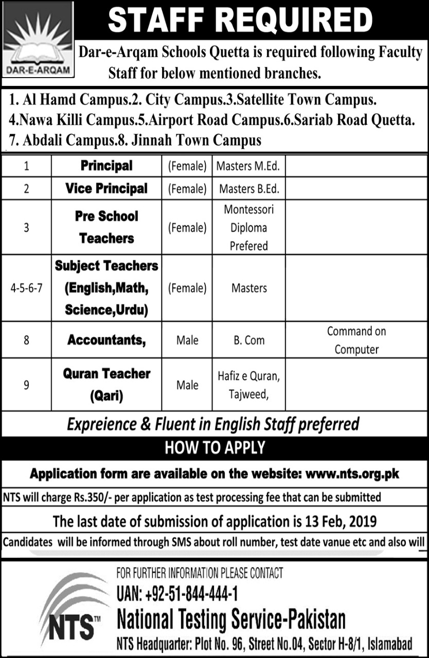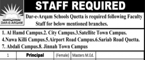 Currently, the organization is looking to recruit knowledgeable professionals for latest offered vacancies at Dar-E-Arqam Schools Quetta that is: